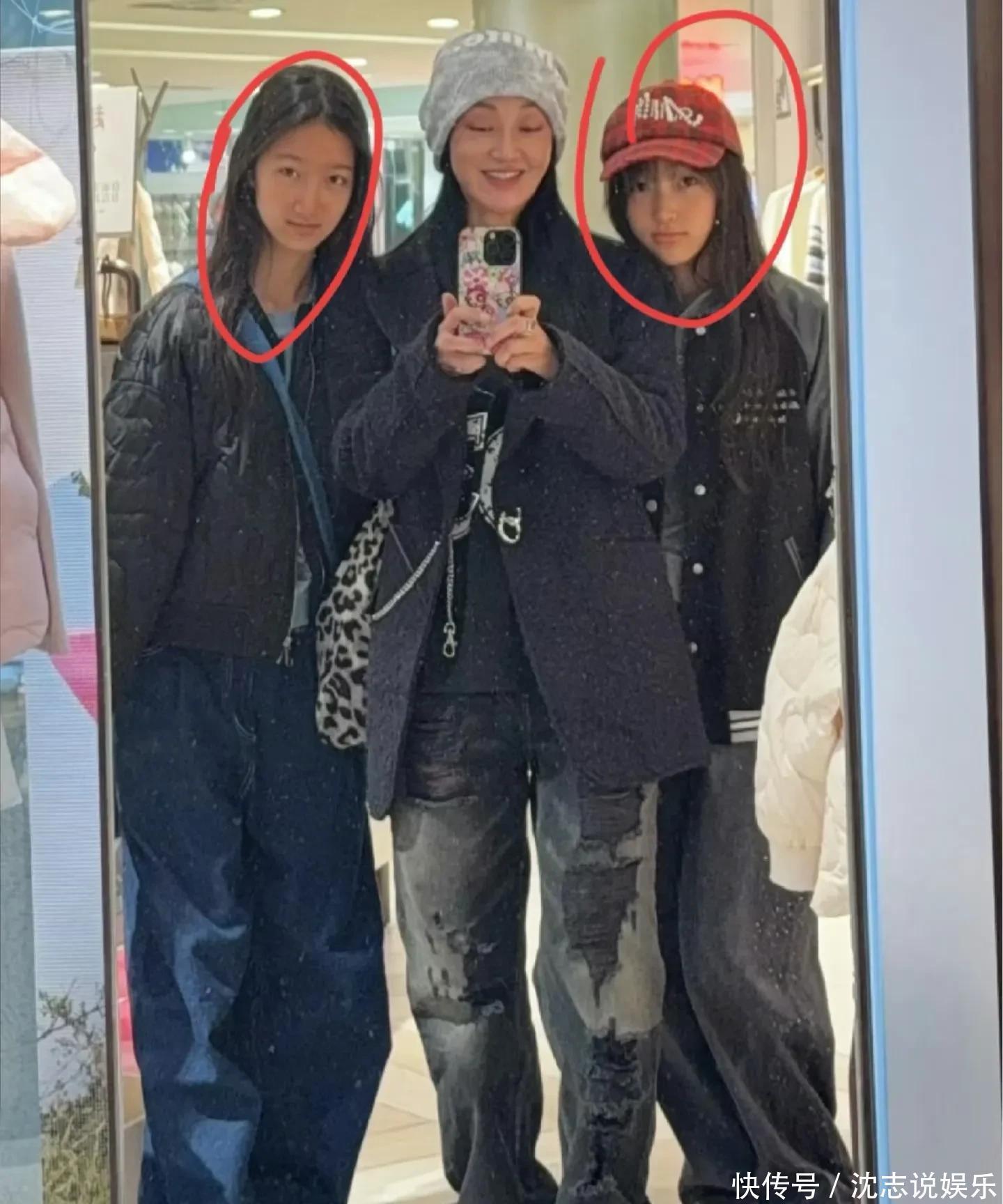 赵子琪穿着黑色西装和深色牛仔裤,戴着灰色针织帽。两个女儿也都穿了黑色外套和休闲裤。母女三人都穿了老爹鞋。说真的,真的分不清哪个是大女儿,哪个是二女儿,姐妹俩长得太像了,如同双胞胎一样,而且长得都像爸爸路金波。